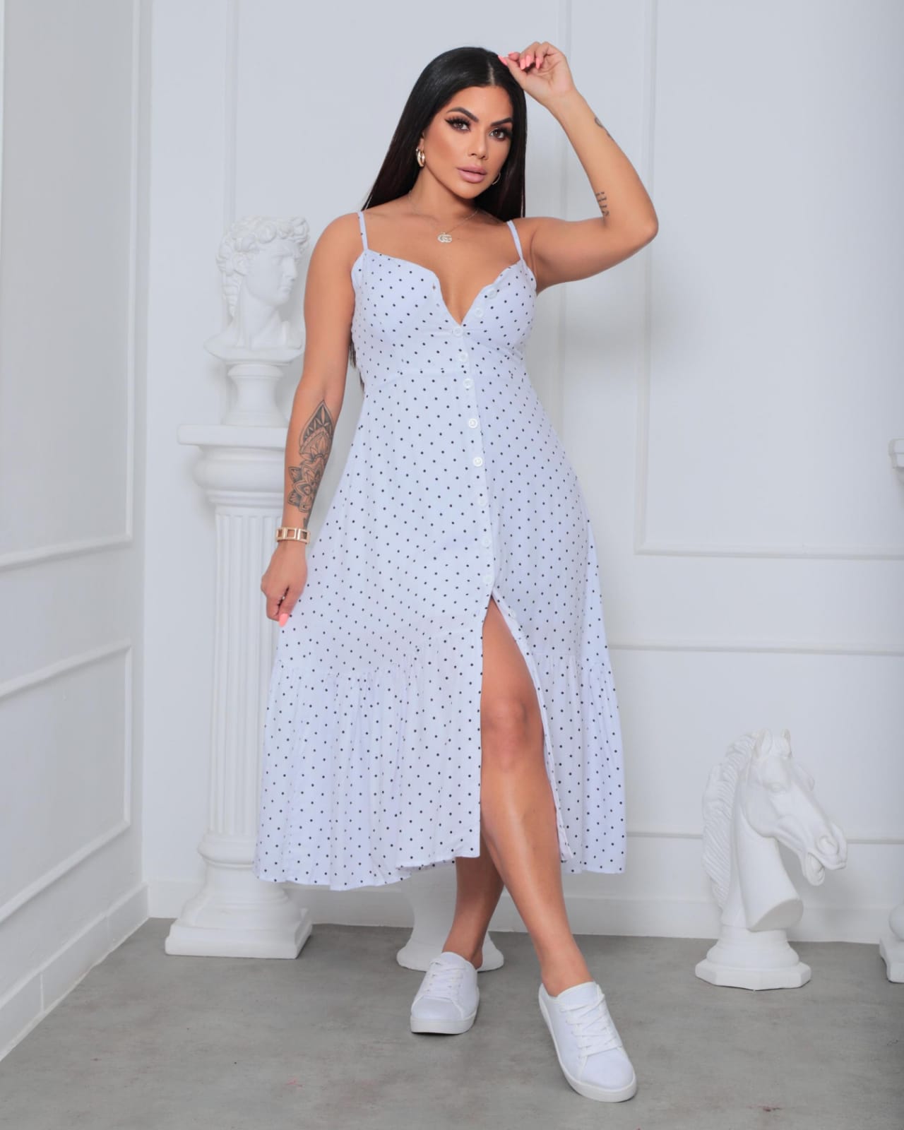 Vestido Midi Poá confeccionado em tecido viscolinho premium, com forro interno que garante conforto e zero transparência. Possui alças reguláveis para melhor ajuste ao corpo e elástico nas costas, oferecendo caimento perfeito e liberdade de movimento. O design delicado e elegante valoriza a silhueta, tornando-o ideal para compor looks sofisticados tanto para o dia quanto para ocasiões especiais. Disponível nos tamanhos M, G e GG.